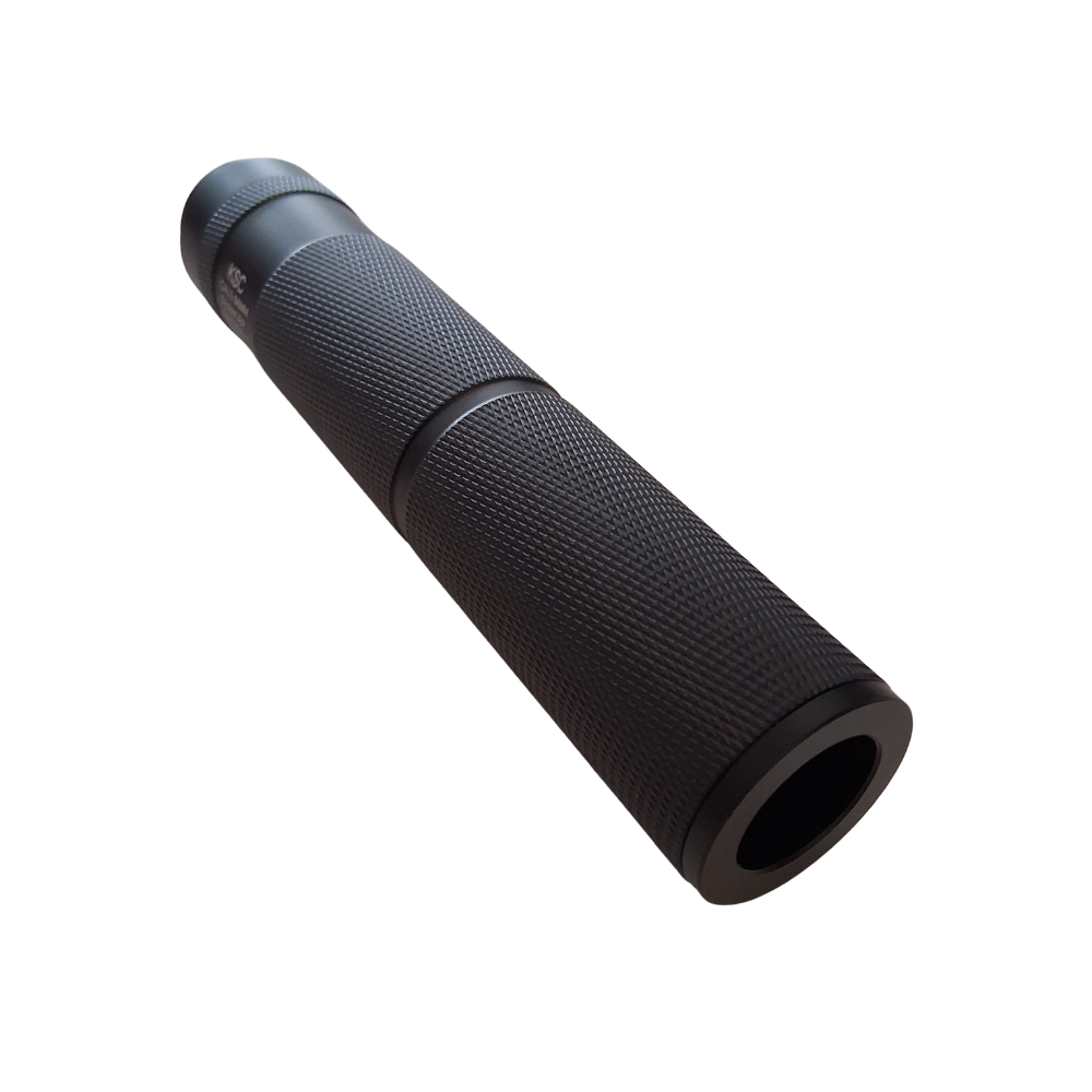 Super lækker lyddæmper fremstillet i aluminium i en simpel konstruktion med et links gevind til at montere på din gelblaster istedet for flammerskjuler.